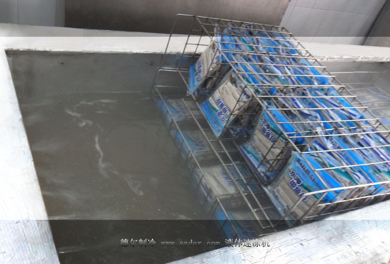 液體速凍機,是速凍中比較常見的一種速凍方式。原理是速凍機將速凍槽內(nèi)的急凍液降溫到較低溫度,凍品包裝后浸入速凍槽內(nèi)的急凍液中,實現(xiàn)快速凍結(jié)。